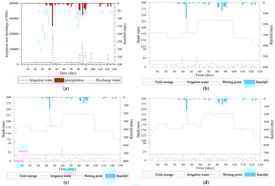 The model was verified with R2 = 0.83 and simulation results are shown in Figure 4. During 50% reduction, the fourth block cannot have sufficient water for the target depth during survival period; however, it obtains the target depth on the 34th day tillering stage. The depth of the fifth block reached below the saturated soil moisture on the 6th day from transplanting due to the shortage of water to the 31st day. On the 21st day, the field storage becomes lower than the field capacity (FC), and the vertical percolation stops. On the 29th day, the field storage becomes much lower and reaches the wilting point (WP), stopping evapotranspiration.