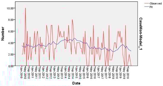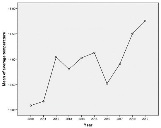 In the examined ten-year period, mean temperatures ranged from −3.3 °C (January 2017) to 27 (July 2012). The coldest month was January every year, while July and August were generally the hottest months (p = 0.001). April to September are considered as summer and spring months with an average temperature of ≥ 15 °C. The hottest years were 2012, 2013 and 2018, with average yearly temperatures of ≥ 15.5 °C. However, there were no significant differences in average yearly temperatures in Belgrade during the examined ten years (p = 0.738). The mean temperatures per year in Belgrade, Serbia, between the years 2010 and 2019 are presented in Figure 2.