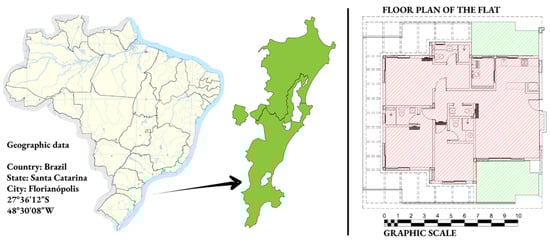 A flat in a multi-family residential building in Florianópolis, Brazil, was chosen to be evaluated for the design of a rainwater harvesting system. The definition considered estimating the water end-uses by monitoring the two residents for sixteen days. Figure 1 shows the location and floor plan of the flat. The green area shows the roof area owned solely by the flat owners, and the red area shows the part of the roof shared with the building and its residents. The flat is located at longitude 48°30′08″ west and latitude 27°36′12″ south.