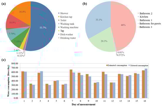 The distributions of the water consumption within rooms and water devices are shown in Figure 2a,b. Figure 2c shows the measured versus metered water consumption. One can see that most of the water consumption occurred in bathroom 1, bathroom 2, and the kitchen, with little demand in the other rooms. Regarding water appliances, consumption was higher for showers, kitchen taps, and toilets.