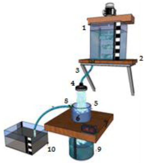 The constant-head permeameter developed in the study. Legend: (1.) Reservoir (volume 5 liters); (2.) reservoir support elevated 50 cm from the sample; (3.) hose (diameter 10 mm); (4.) plastic shower for water flow control; (5.) plastic mould in which the sample is inserted; (6.) sample with lateral waterproofing by silicone; (7.) support to fix the sample; (8.) a spillway (3/8” gauge) to keep the water level above the sample; and (9.) a water collector from the spillway.