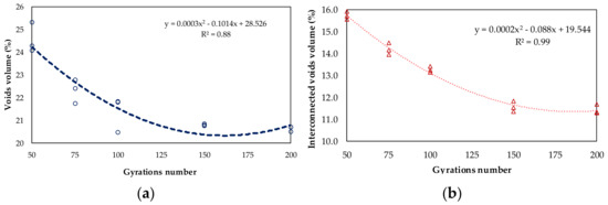 As a function of the number of gyrations, Figure 4a presents the reduction in void volume, and Figure 4b the interconnected void volume.