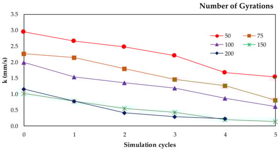 Table 2 presents the regression coefficients obtained (Equation (2)) for each group of samples (number of gyrations). Table 3 shows the obtained average values of void volume, interconnected void volume, and permeability coefficients for the sample group as a function of the number of gyrations. The permeability coefficient reduction (kr) was calculated by Equation (2) when the interconnected void volume reached a value of 12%, and then the intervention time can be estimated.