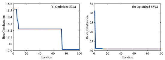 The optimization process—the recordings of the best cost per iteration for ELM and SVM; the best costs per iteration of (a). optimized ELM model and (b). optimized SVM model.