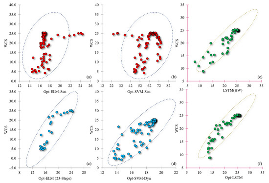 The scatter plots of forecasted data points vs. observed WCS based on duration, stat: long-term-static, 77-step forecast, Dyn: 1-step forecast, Opt: Optimized. (a). static forecast of Opt.ELM, (b). static forecast of Opt.SVM, (c). short-term forecast of Opt.ELM, (d). dynamic forecast of Opt.SVM, (e). LSTM with HW preprocess, (f). forecast of Opt.LSTM, all vs. WCS [8].