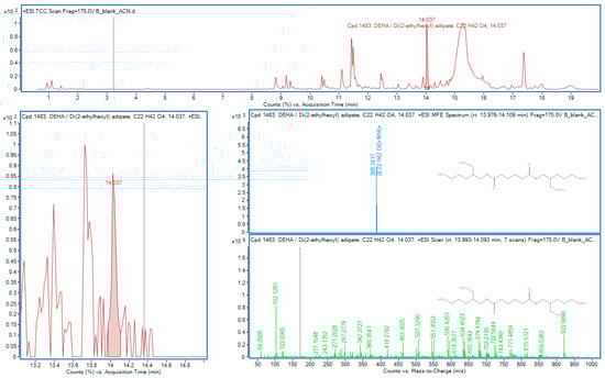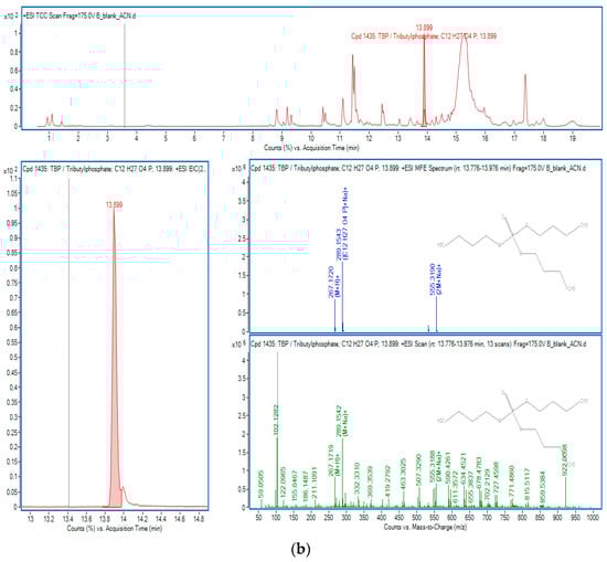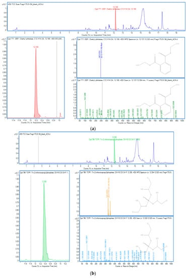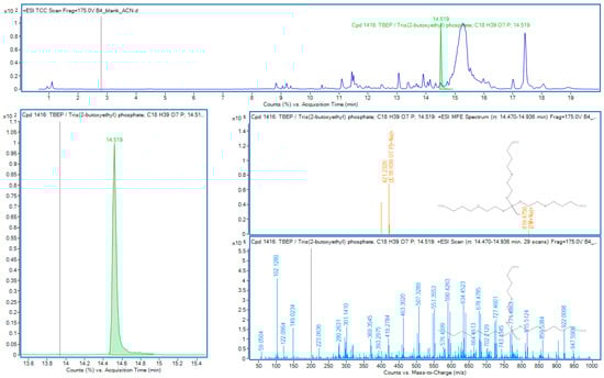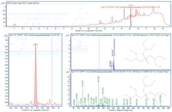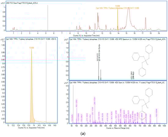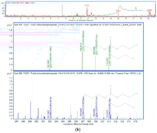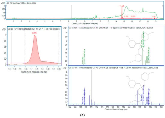 The OPEs that were detected with the above-mentioned methodology were identified with the Agilent Water Screening Personal Compound Database and Library (PCDL), and the results are shown in Figure 1, Figure 2, Figure 3, Figure 4, Figure 5 and Figure 6.
