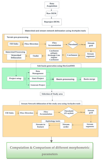 For the generation of watershed and sub-basins from both the DEMs, the procedure was carried out using ArcHydro tools and HecGeoHMS in ArcGIS (v 10.5).