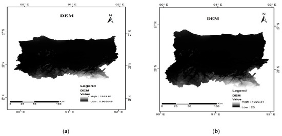 The specifications of the datasets used in the present study are mentioned in Table 1. The two DEMs used are the MERIT DEM developed by Dr. Yamazaki, University of Tokyo by removing multiple error components from existing spaceborne DEMs (SRTM and AW3D), which represents the terrain elevations at a 3 sec resolution (~90 m at the equator), and the FABDEM, which is the first global DEM (30 m resolution) that used Machine Learning to remove building and tree height biases from Copernicus GLO 30 DEM. The tiles of MERIT DEM and FABDEM were downloaded from the following websites: http://hydro.iis.u-tokyo.ac.jp/~yamadai/MERIT_DEM/ (accessed on 13 August 2022), https://data.bris.ac.uk/data/dataset/25wfy0f9ukoge2gs7a5mqpq2j7 (accessed on 17 August 2022). They were then mosaiced and clipped according to the study area in ArcMap.