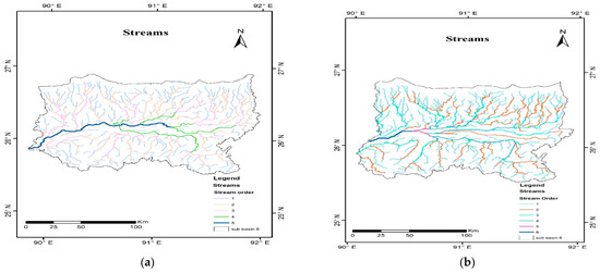 Different linear, areal and relief aspects including basic parameters such as area and perimeter were computed for the study area. The values of these morphometric parameters derived from both the DEMs are shown in Figure 5. It was observed that the area delineated using MERIT DEM is larger (24,628.2 km2) compared to FABDEM (21,425.6 km2). This is likely because in the study area we have chosen, FABDEM was still determined to have random artifacts and pits which were not corrected accurately [6]. Through visual interpretation, it was observed that the streamlines delineated using MERIT DEM were more accurately aligned compared to FABDEM. The sub-basin derived using MERIT DEM showed that it is governed by highest fifth-order stream, while that derived using FABDEM is governed by sixth-order stream, both indicating a dendritic drainage pattern. Although FABDEM has higher resolution compared to MERIT DEM, the total number of streams of FABDEM (493) is smaller than that of MERIT DEM (545) as the sub-basin’s area delineated for it is smaller.