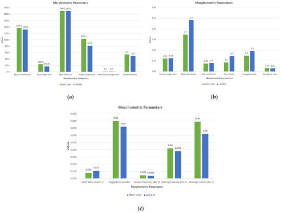 (a–c) shows different morphometric parameter values derived from MERIT DEM and FABDEM.