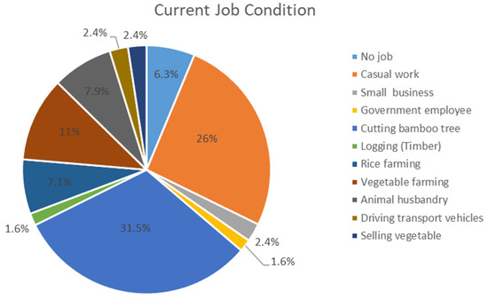 Figure 5 describes the current job conditions of the respondents in three villages: 26.0% of respondents were casual workers and 31.5% relied on cutting bamboo trees for a living. Few respondents were engaged in rice and vegetable farming, driving transport vehicles, running small businesses, logging and serving in the government sector.