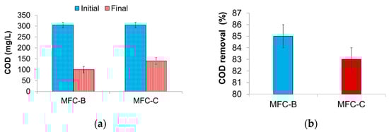 As shown in Figure 1a, the COD decreased in the anodic chamber of both MFC-B and MFC-C. The initial COD was 305 mg/L for both MFC-B and MFC-C. The final COD was 100 mg/L for the batch mode, and the removal efficiency was thus 67.2%. In the case of the continuous flow mode, the final COD was 140 mg/L, and the removal efficiency was thus 54%. There was a difference of 13.2% in the removal efficiency. The possible reason for the high COD removal in the batch mode was that there was more time available for the microorganisms to consume the already existing COD, whereas in the continuous flow mode, new COD was pumped in the reactor continuously. Another similar study quoted their COD removal efficiency to be in the similar range of 50 to 65% []. Figure 1b shows the COD removal in the cathodic chamber. The removal from the cathodic chamber was 85% in MFC-B and 83% in MFC-C.