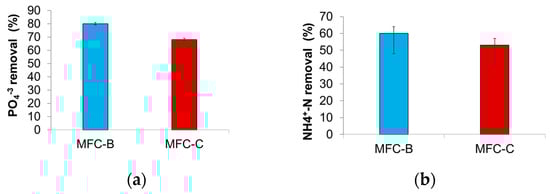 Figure 3a shows that the orthophosphate removal of MFC-B was 80% whereas it was 68% for MFC-C. MFC-B was able to achieve a high orthophosphate removal of 12% as compared to MFC-C. Figure 3b shows that an ammonium nitrogen removal percentage of 60% was achieved in the batch mode and it was around 57% in the continuous flow mode.