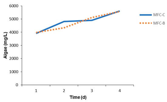 In Figure 4, an increasing trend can be seen in algal growth. The dotted line shows algal growth in MFC-B and the solid line shows algal growth in MFC-C. There was a similar trend in both mMFCs starting at around 4900 mg/L and growing to about 5700 mg/L in four days.