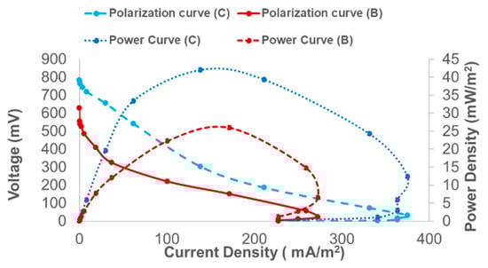Figure 5 shows the polarization and power curves for MFC-B and MFC-C. The maximum current density was 375 mA/m2 in MFC-C and 272.2 mA/m2 in MFC-B. The maximum power density was 42 mW/m2 in MFC-C and 25.9 mW/m2 in MFC-B. By calculating the slopes of the polarization curves, the internal resistance was obtained to be 867.875 Ω in MFC-C and 847.250 Ω in MFC-B. In the continuous flow mode, the internal resistance is more than that in the batch mode, and the power density and current density were also greater. This may be due to the microbial configuration of sludge in the continuous flow mode, in which it was possible that the number of current-producing bacteria was greater in the continuous flow mode than in the batch mode.