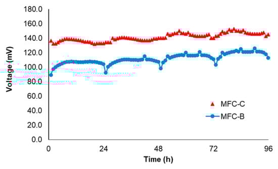 As shown in Figure 6, the voltage in the continuous flow mode was greater than in the batch mode. In the batch mode, there were dips in the values of voltage after every 24 h, indicating that the batch has ended and most of the COD has been consumed. In addition, the maximum value was achieved in the middle of the batch in the batch mode and the value steadily decreased towards the end of the batch after every 24 h. The curve of the continuous flow mode was relatively steady because of the continuous feed. Thus, COD was always available to the microorganisms, and voltage was constantly produced.