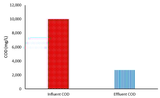 Figure 7 shows a decrease in the value of COD of wastewater in MEC. The initial COD of the wastewater was 10,000 mg/L and after running a batch of 10 days, the value had decreased to 2700 mg/L, indicating a removal efficiency of 73%. The voltage provided by the mMFCs initiated a forceful current and was utilized to reduce the protons into hydrogen []. The average hydrogen production rate at the same time was 9.8 ± 0.2 mL L−1 d−1.
