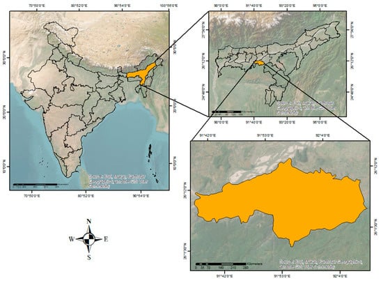 The Kamrup Metropolitan district, which is located in the state of Assam in the north-eastern part of India, covers an area of 1528 km2. The study area stretches from 26.07° N latitude to 91.63° E longitude in the lower basin of Brahmaputra, which is prone to rapid flooding nearly every year (Figure 1).