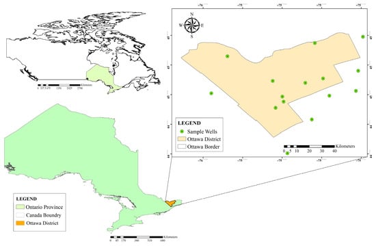 Ottawa city, with the area of 2790 km2, is located in in the east of southern Ontario. This city is located at latitude 45°25′29″ N and longitude 75°41′42″ W, with an elevation of 70 m above sea level. The climate is semi-continental, with a warm, humid summer and a very cold winter. The temperature typically varies from −14 °C to 27 °C, while the mean precipitation is 920 mm. Rain falls throughout the year in Ottawa. The highest mean monthly rainfall in Ottawa is in July, with an average rainfall of 76 mm, while the lowest rainfall month is February, with an average rainfall of 12.7 mm. The study area involved different residential and industrial regions which supply the needed water from groundwater resources. Groundwater is one of the main sources of water in this area. There are lots of wells in the study area’s aquifers that have high potential as a source of drinking water. The location of the study area is illustrated in Figure 1.