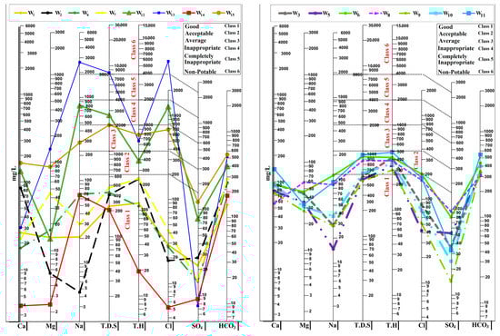 In this study, the water quality parameters of sample wells in the city of Ottawa for the drinking sector were studied using the Schoeller diagram and the GWQI Index. Therefore, based on Schoeller’s classification, the amounts of cations such as calcium (Ca), magnesium (Mg), sodium (Na), and anions such as chloride (Cl), sulfate (SO4), bicarbonate (HCO3), and two important parameters of total dissolved solids (TDS), and the total hardness (TH), were checked in the diagram, which is shown in Figure 2.