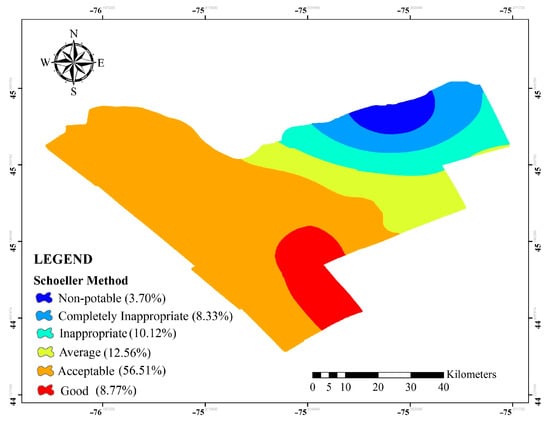 Water is one of the substantial requirements in planning, developing, protecting, and controlling water resources. Improper and inefficient assessment and management of surface and groundwater could provide essential risks in the fields of human health and well-being, food security, industrial development, and the life of ecosystems [1,2,3,4]. Groundwater is considered one of the most important resources worldwide in the drinking and agriculture sectors. During the last few years, urbanization and population growth have led to an increase in the use of groundwater resources. Therefore, water quality evaluation is one of the significant problems in groundwater studies [5]. Variation in the quality of water resources is a great danger in usage by the agricultural, urban, and industrial sectors [6,7]. Several methods have been developed for water quality determination. Among these key methods to evaluate and manage groundwater resources for drinking purposes, the Schoeller diagram and the Water Quality Index (WQI) methods are the most common. In this study, to assess the water quality of groundwater, the Schoeller diagram, Canadian Groundwater Quality Index (GWQI), and Geographic Information System (GIS) were combined. Schoeller’s semi-logarithmic diagram is widely used to compare groundwater quality. This graph shows the concentration differences between water samples. It is classified based on several physio-chemical parameters to evaluate the quality of groundwater [8]. The GWQI method has high capability for groundwater quality assessment across the world. In the GWQI index based on GIS, several chemical parameters affecting the quality of groundwater are integrated. GIS is used for the interpolation and classification of water quality parameters. For this purpose, the kriging method was applied to interpolate each data layer of water quality parameters. Further, to reduce the uncertainties of the obtained results, interpolation map layers were converted to fuzzy set in GIS environment.