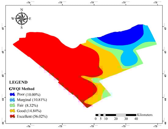 Computed GWQIs were classified into five categories including excellent, good, fair, marginal, and poor for human consumption in Table 2 [19]. The outcome of the index includes a number between 0 (worst water quality) and 100 (best water quality) [20,21].