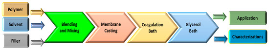 Although cellulose acetate (CA) was initially used as the casting solution when it was first invented by Loeb and Sourirajan in the 1960s [11], it may also be used with other polymers that can be dissolved into homogenous solutions. A polymer, a solvent, and a coagulation medium are the only three components typically needed for the phase inversion process (or non-solvent). Figure 2 illustrates the fabrication of a polymer membrane using the phase inversion method.