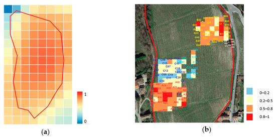 (a) CWSI map evaluated through atmospheric data by Landsat 8 and Copernicus database (14 July 2018); 30 × 30 m resolution. (b) CWSI map based on ground-collected data (4 June 2022); 10 × 10 m resolution.