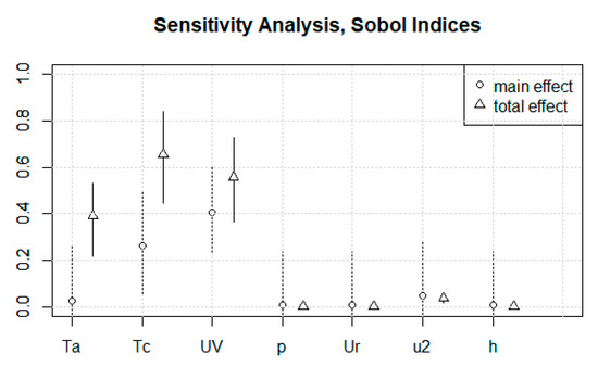 Main and total effects, and 0.95 confidence intervals for variables: Atmospheric Temperature (Ta), Canopy Temperature (Tc), UV Radiation (UV), Atmospheric Pressure (p), Relative Humidity (Ur), Wind Speed (u2) and Ground Height (h).