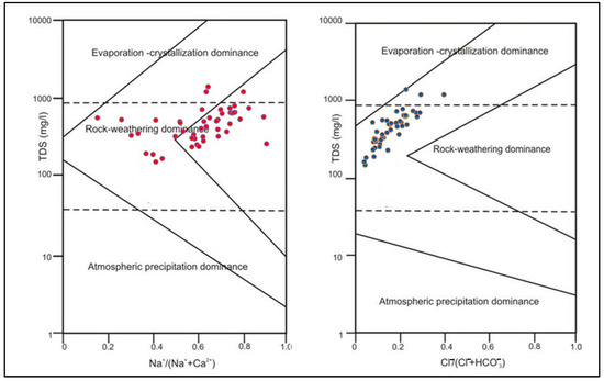 A Gibbs diagram was used for the geochemical evolution of groundwater, as well as evaluating evaporation, weathering, and precipitation in arid and semi-arid regions [4]. We can see in Figure 3 that most of the samples are plotted in the field of the rock dominance area, indicating that the main geochemical process is rock–water interaction in the study area.
