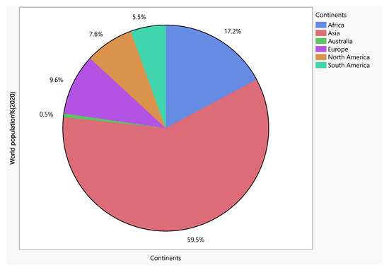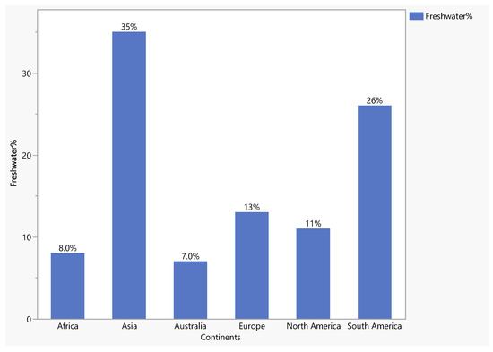 Water consumption is different in different continents, based on the freshwater availability according to their population. Asia is a major portion of land consisting of higher freshwater density than other continents. It is more than the entire calculation for Africa, Australia, Europe, and the Americas, respectively, which was 8%, 7%, 13%, and 26% + 11% of the total, as shown in Figure 2.