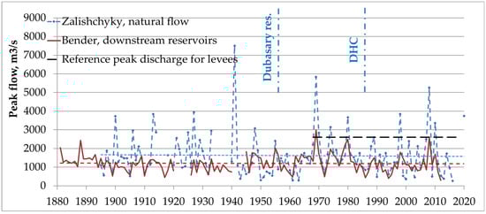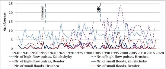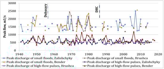Assessment of reservoirs impact on the Dniester floods was also performed by analyzing the characteristics of the environment flow components: high-flow pulses, small floods, large floods. Large floods, with peak discharges exceeding 2600 m3/s (reference peak flow indicated in DHC rules [], as well as for levee system) at Hrushca st. were recorded in 1969, 1974, 1980 before the DHC and in 2008 after beginning of its operation (Figure 1). Small floods (with peak discharges exceeding 1200 m3/s—the multiannual average of peaks for entire monitoring period at Bender) are bigger in number. For the years 1945–1955 (before the Dubasary reservoir construction), at Zalishchyky and Bender on average one case of small floods in 2 years was recorded. In the period after the beginning of reservoir operation, the average number of these events was 1.4 event/year at Zalishchyky, 1.5 event/year at Hrushca, 0.8 event/year at Bender st. in the second period and 1 event/year at Zalishchyky, and 0.4 event/year for both stations in the downstream in the third period. During the Dubasary dam operation, in the upstream (at Hrushca), three small floods were registered in 1968, 1976, 1978, 1980, 1981; in the downstream (at Bender), the same number was recorded only in 1968; and in the other mentioned years their number decreasing to 1–2 events. In the years after the DHC construction, at Zalishchyky, three small floods were registered in 1991, 2001, 2005; five cases in 1998; and in the downstream not more than two small floods/year were recorded, but the number of years without small floods increased (Figure 5). The average value of small floods peak discharges (Figure 6) was 1584 m3/s at Zalishchyky and 1692 m3/s at Bender for the years 1945–1955; 1596 m3/s at Zalishchyky, 1670 m3/s at Hrushca, and reduced to 1600 m3/s at Bender st. (downstream from the Dubasari dam) for the period of only the Dubasari res. operation; and 1662 m3/s at Zalishchyky, 1451 m3/s at Hrushca, and 1634 m3/s at Bender for the period after the entire flood protection system construction. On an average, small floods duration was for the Dubasary dam operation period—10 days at Zalishchyky, 25.4 days at Hrushca, and 65 days at Bender; and for the period after DHC construction—15 days at Zalishchyky, 23 days at Hrushca, and 47 days at Bender [].