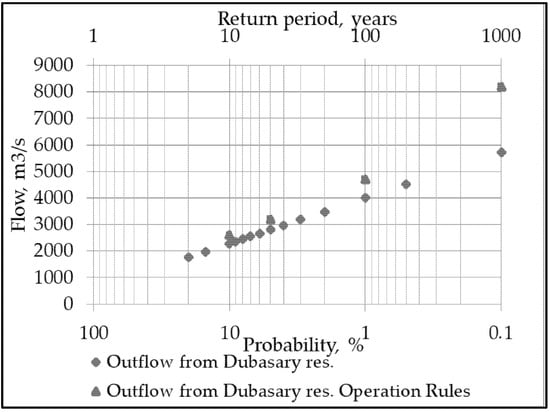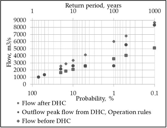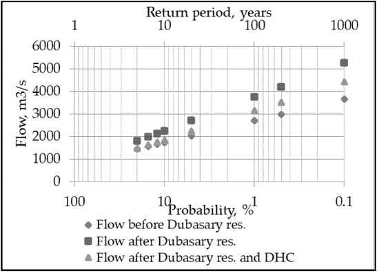 The flood protection system reduces the probable peak discharges of 10–20% by 1–6%. It has a greater effect on regulating the flood runoff with the probability of up to 10%, especially during the period after the DHC construction. Thus, this hydropower complex has a more significant positive influence on the regulation of the flood runoff compared to the Dubasary reservoir [].