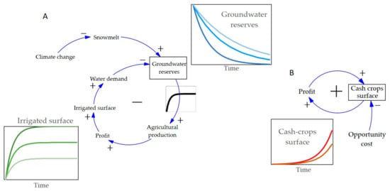 In complex systems, such as socioecological systems, different types of loops coexist. In Figure 1B we show a positive one, which results in exponential growth (or decay) of the variables (typical behavior of the Anthropocene []). Indeed, as the profitability of a certain type of crop increases, in this case, cash crops, and the other alternatives are very unprofitable (i.e., low opportunity cost), more and more farmers opt for this alternative, which leads to an increase in the irrigated area. This leads to more profits and new farmland, leading to exponential growth in cash crop area. As it is easy to understand, this exponential behavior, towards infinity, cannot be sustained over time, but it allows us to see that, in isolation, there are parts of the system that for a time behave in a threatening way, putting the sustainability of the whole system at risk.