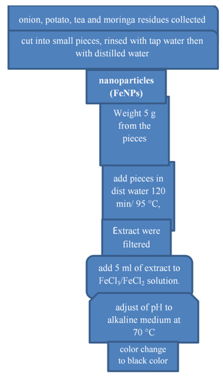 This work aims to prepare iron nanoparticles from extracted waste natural materials (WNMs), as shown in Figure 1. The magnetic iron nanoparticles were synthesized using a mixture of FeCl3·6H2O and FeCl2·4H2O, aided with onion, potato, tea, and moringa extracts. These materials were obtained from the local markets, Giza, Egypt. They were prepared by washing onion peels, potato peels, tea waste, and moringa leaves several times using tap water to remove any dust, and then they were rinsed and dried at room temperature. The onion peels, potato peels, and moringa leaves were cut into small pieces. Then, approximately 50 g of every waste extract was weighed and boiled in 500 ml of tap water for 30 min. The filtrate of the extract was kept at 4 °C in the refrigerator [4,15]. The magnetite nanoparticles were prepared from the extracts by adding 5 ml of extract to a bottle of iron solution with the simultaneous drop-wise addition of NaOH (I N) solution (this process was carried out at 80 °C, and the solution was mixed at 1000 rpm for 2 h) [16]. The synthesis of nanoparticles was observed by the changing color of the solution from orange to black; the formation of Fe/NP was confirmed by the appearance of a black precipitate [15]. Fe/NPs were separated by centrifugation at 1000 rpm/min, collected, and dried in a dry oven at 50 °C for 48 h [11].