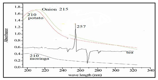 UV–Vis absorption spectrum of onion, potato peels, tea waste, and moringa magnetite nanoparticles.