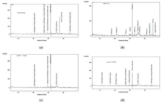 The XRD was obtained to investigate the presence of nanoparticles on moringa, potato, onion, and tea surface. The XRD pattern of the synthesized adsorbent was in the angle range of 2θ, applying Cu kα radiation (λ = 1.5 Å). The XRD technique was used to identify the structure of the prepared iron nanoparticles and is depicted in Figure 4.