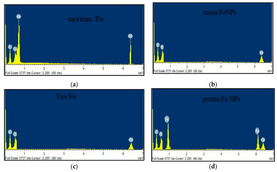 EDX analysis was then performed on the surface of the Fe/NPs, as shown in Figure 5; the EDX results of onion, potato peels, tea waste, and moringa magnetite nanoparticles reveals the elemental composition of the prepared nanoparticles. The EDX profile shows intense peak signals of iron with a Kα peak at 6.5 keV, 6.2 keV, 0.9 keV, and 0.7 keV. Other signals observed include that of oxygen and carbon; the presence of C and O peaks were related to polyphenols or any other C and O containing a compound in the natural materials’ extract. The existence of elemental iron and oxygen demonstrate that the nanoparticles were essentially present in oxide form [11]. The percent of detected elements were carbon (C) 12%, iron (Fe) 52%, and oxygen (O) 28%. These results indicate the extract of moringa leaves and potato peels were more highly efficiency than onion and tea for the formation of magnetite iron nanoparticles. Very similar results were reported for Fe nanoparticles prepared with the other leaf [11].