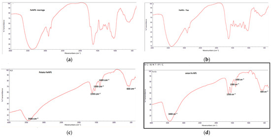 The FT-IR measurements were carried out to identify the possible bio-molecules responsible for the reduction of ferrous chloride and capping of the reduced Fe/NPs. The FT-IR spectra of Fe/NPs after preparation by the green synthesis method from onion, potato peels, tea waste, and moringa extracts are shown in Figure 6. All of the above peaks which can be detected in the spectrum of synthesized Fe/NPs were subjected to FT-IR that showed various bands; the O-H stretching at approximately 3400 cm−1 showed the presence of hydroxyl groups from the polyols such as flavones, terpenoids, and polysaccharides present in the various extracts. The decrease in intensity of band O-H stretching in onion and potato might be due to the interaction of nanoparticles. The bands at 1645 cm−1 and 1041 cm−1 denote the presence of organic material in the sample, majorly contributed by onion, potato peels, tea waste, and moringa iron magnetite particles (Fe/NPs). These bands confirmed the presence of compounds such as flavonoids and terpenoids and, hence, may be held responsible for the efficient capping and stabilization of the obtained magnetite nanoparticles [11].