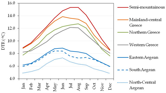 In addition to the observed differences in DTR magnitude between the climatic zones, monthly variability patterns present some distinct features between the different zones (Figure 1). In the mountainous areas, as well as in Northern and Western Greece, higher DTR values occur in late summer (August). By contrast, the islands’ monthly variability of DTR displays a rather fluctuating pattern (consistent across the Aegean), peaking in early summer (June), followed by a sharp decline in July and August, especially in the South Aegean. This pattern is likely due to the influence of Etesian winds, which are particularly strong during daytime in the Aegean from July to August and disproportionately affect daily maximum and minimum temperatures.