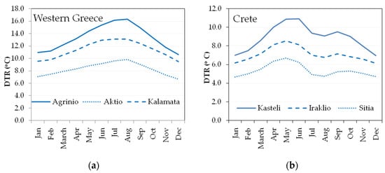 Stations belonging to the same climatic zone may have different DTR values depending on their proximity to the sea and other local factors, despite having similar intra-annual variability patterns. This is for instance the case between Aktio (coastal station) and Agrinio (inland station) of Western Greece (Figure 2a), or the stations of Crete (South Aegean) where DTR decreases considerably as we move from western (Kasteli) to eastern stations (Sitia), while maintaining the same fluctuating pattern of the intra-annual variability (Figure 2b).