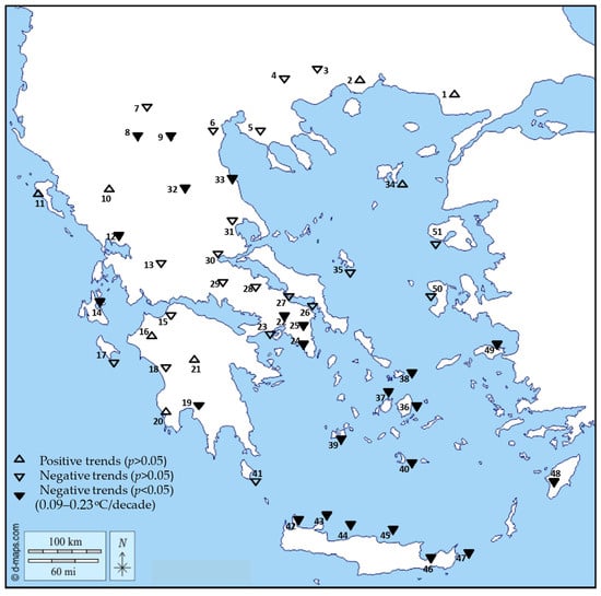 In this study, we used homogenized time series of Tmax and Tmin (1960–2022) from 50 weather stations of the HNMS and the NOA’s historical climate station. Table 1 includes the names and altitudes of the stations. The stations’ locations according to the numbering of Table 1 are indicated in the map included in Section 3.2 (below). The selected stations are distributed across Greece, representing almost all geographical areas of the country. Greece is characterized by an impressive variety of local climates. Climate conditions in Greece are modulated by numerous factors, such as topography, proximity to the sea, local circulations, and levels of urbanization. Following the procedure of Mamara et al. [], we classified the selected stations into seven geographical areas according to their location or other features: (a) Northern Greece (stations 1–6 in Table 1); (b) semi-mountainous stations of the Greek mainland and Peloponnese (stations 7–10, 21, 29); (c) Western Greece (11–20); (d) Mainland Central Greece (22–33); (e) North and Central Aegean (34–41); (f) South Aegean (42–48); and (g) East Aegean (49–51).