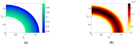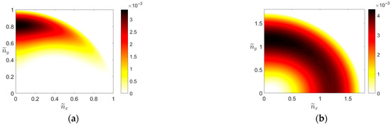 We calculate the feedbacks in the case of large stratification, that is, for . Figure 1 and Figure 2 illustrate the barotropic and baroclinic feedbacks, respectively, as a function of the non-dimensional wavenumbers of the mean flow perturbations for the non-dimensional planetary vorticity gradient . It is noted that the flux feedbacks are symmetric to shifts of the wavevector angle by . The feedbacks are thus shown only in the first quadrant, that is, for positive values of and .