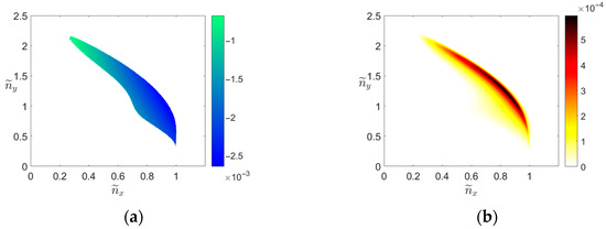 The barotropic flux feedbacks (a) and (b) as a function of the mean flow perturbation wavenumbers and for and . Only positive values of the feedbacks are shown.