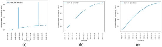 Figure 1. (a) The cumulative water consumption measurements of the 24895800 SWM; (b) the time series after removing outliers; (c) the time series after filling the gaps using linear interpolation. - Time series resample. The 76 time series, one for each SWM, are resampled with a 10 min frequency. The process does not change the frequency of the time series but adds the missing timestamps. The missing values are filled with NaNs;