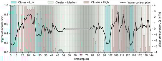 The selected number of clusters to proceed with is three. The fuzzy partitioning coefficient is high (~88%), meaning there is a crisp partitioning of the data. The transformed water consumption values lower than −1 are labeled as low (Cluster 1). The transformed water consumption values ranging between −0.926 and 0.616 are labeled as medium (Cluster 2), and those exceeding 0.619 are labeled as high (Cluster 3). In Figure 2, the transformed water consumption values are shown on the secondary y-axis over the degree of membership in each of the three clusters (primary y-axis) for a total of 1 week. As an example, during the 108th timestep, the consumption peaks, and the membership is 100% allocated in Cluster 3 (brown color) and is thus labeled by the model as high.