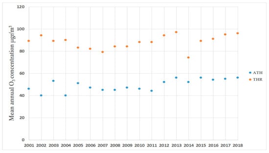 Figure 2 presents the temporal variation of the average concentration of the pollutant O3 for the period 2001–2018. Overall, at the southwestern suburb of Thrakomakedones, the mean annual concentrations range from 74 to 96 μgr/m3, much higher than in the Athens center (range: 40–56 μgr/m3, station: Athinas).