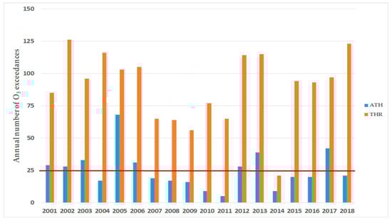 As shown in Figure 3, at the Thrakomakedones station, the O3 concentration limit (120 μg/m3) was exceeded many times throughout the period under consideration. Specifically, in 2018 the concentration exceeded 123 times at the Thrakomakedones station, while at the Athinas monitoring station it was exceeded only 21 times. It should be mentioned that the target value should not be exceeded on more than 25 days per year (red line in Figure 3). In general, O3 concentration threshold was exceeded in the Thrakomakedones station about 90 times per year, while in the Athinas monitoring station, it was exceeded only 25 times. This occurs because the sea breeze that blows encloses the O3 at the foothills of Parnitha.