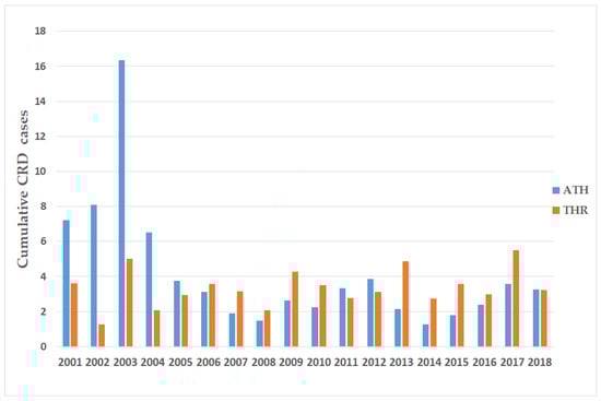 Annual variation in cumulative CRD cases due to O3 at Athinas and Thrakomakedones stations. Period: 2001–2018.
