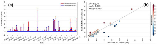 Comparison of actual and predicted 3 h instantaneous rainfall plots (a) and (b) in the station of Grevena with results from the Random Forest model.